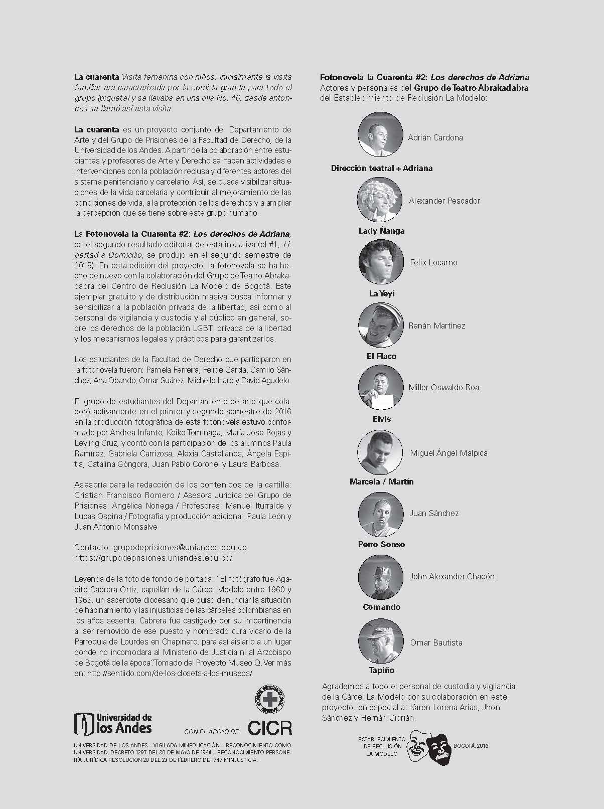 La segunda fotonovela de La 40 busca informar y sensibilizar a la población reclusa, así como al personal de custodia y al público en general, sobre los derechos de la población LGBTI privada de la libertad y los mecanismos legales y prácticos para garantizarlos. Este proyecto se realizó de forma conjunta a partir de una creación Grupo de Teatro Abrakadabra, dirigido por Adrián Cardona, del establecimiento carcelario la Modelo de Bogotá, con el apoyo y financiación del Comité Internacional de la Cruz Roja, y la ayuda de estudiantes del curso de Arte y Cárceles de la Facultad de Artes y Humanidades y del Grupo de Prisiones de la Universidad de los Andes.