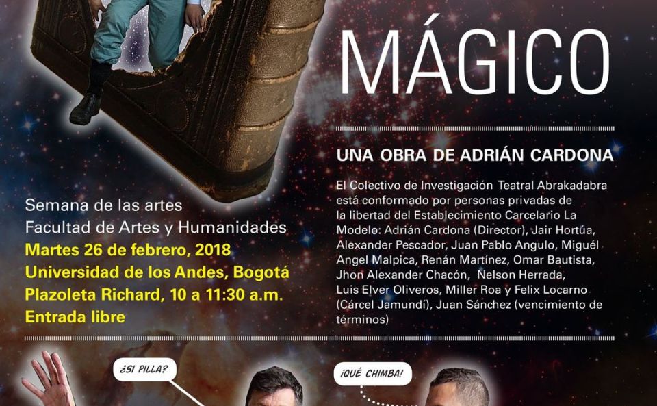 Martes 26 de febrero, Universidad de los Andes, Bogotá,Plazoleta Richard (justo al lado de La Capilla), 10 a 11:30 a.m. Entrada libre. El Colectivo de Investigación Teatral Abrakadabra está conformado por personas privadas de la libertad del Establecimiento Carcelario La Modelo: Adrián Cardona (Director), Jair Hortúa, Alexander Pescador, Juan Pablo Angulo, Miguél Angel Malpica, Renán Martínez, Omar Bautista, Jhon Alexander Chacón, Nelson Herrada, Luis Elver Oliveros, Miller Roa y Felix Locarno (Cárcel Jamundí), Juan Sánchez (vencimiento de términos). La presentación contó con el apoyo de las personas del curso de Arte y Cárceles del Laboratorio de Estudios en Artes y Patrimonio de la Universidad de los Andes.