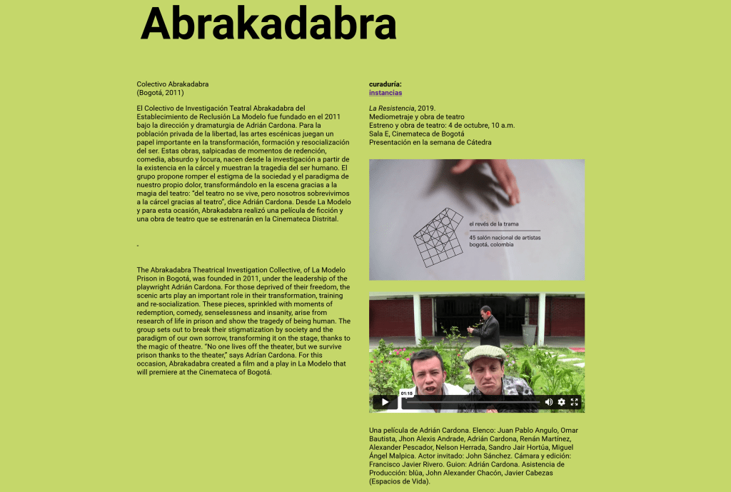 El Colectivo de Investigación Teatral Abrakadabra del Establecimiento de Reclusión La Modelo fue fundado en el 2011 bajo la dirección y dramaturgia de Adrián Cardona. Para la población privada de la libertad, las artes escénicas juegan un papel importante en la transformación, formación y resocialización del ser. Estas obras, salpicadas de momentos de redención, comedia, absurdo y locura, nacen desde la investigación a partir de la existencia en la cárcel y muestran la tragedia del ser humano. El grupo propone romper el estigma de la sociedad y el paradigma de nuestro propio dolor, transformándolo en la escena gracias a la magia del teatro: “del teatro no se vive, pero nosotros sobrevivimos a la cárcel gracias al teatro”, dice Adrián Cardona. Desde La Modelo y para esta ocasión, Abrakadabra realizó una película de ficción y una obra de teatro que se estrenarán en la Cinemateca Distrital. –
