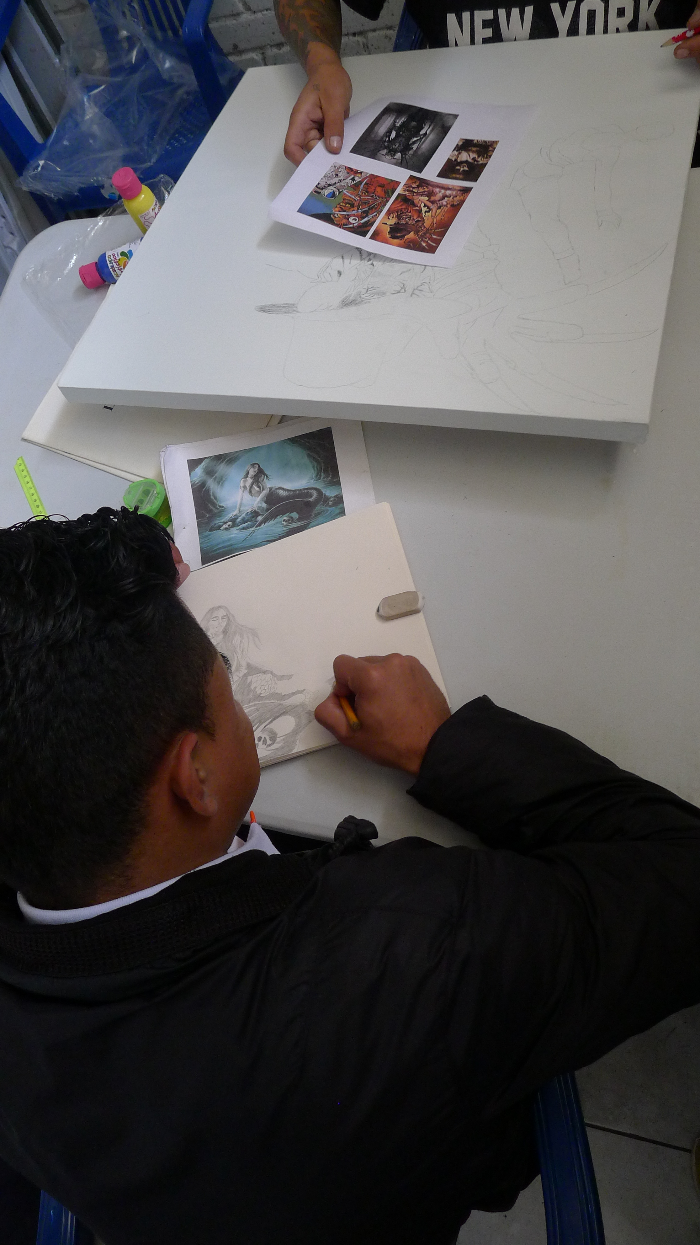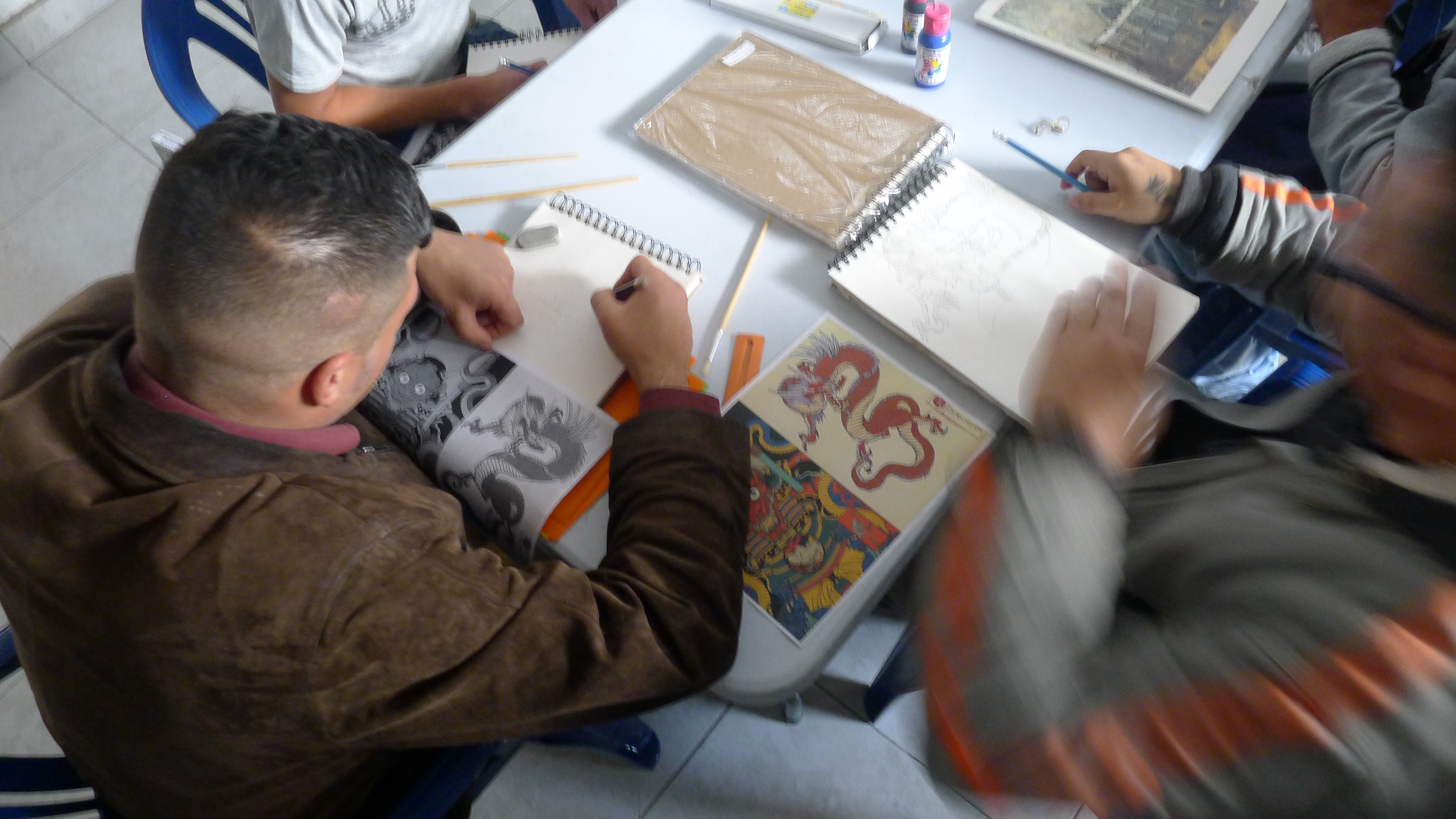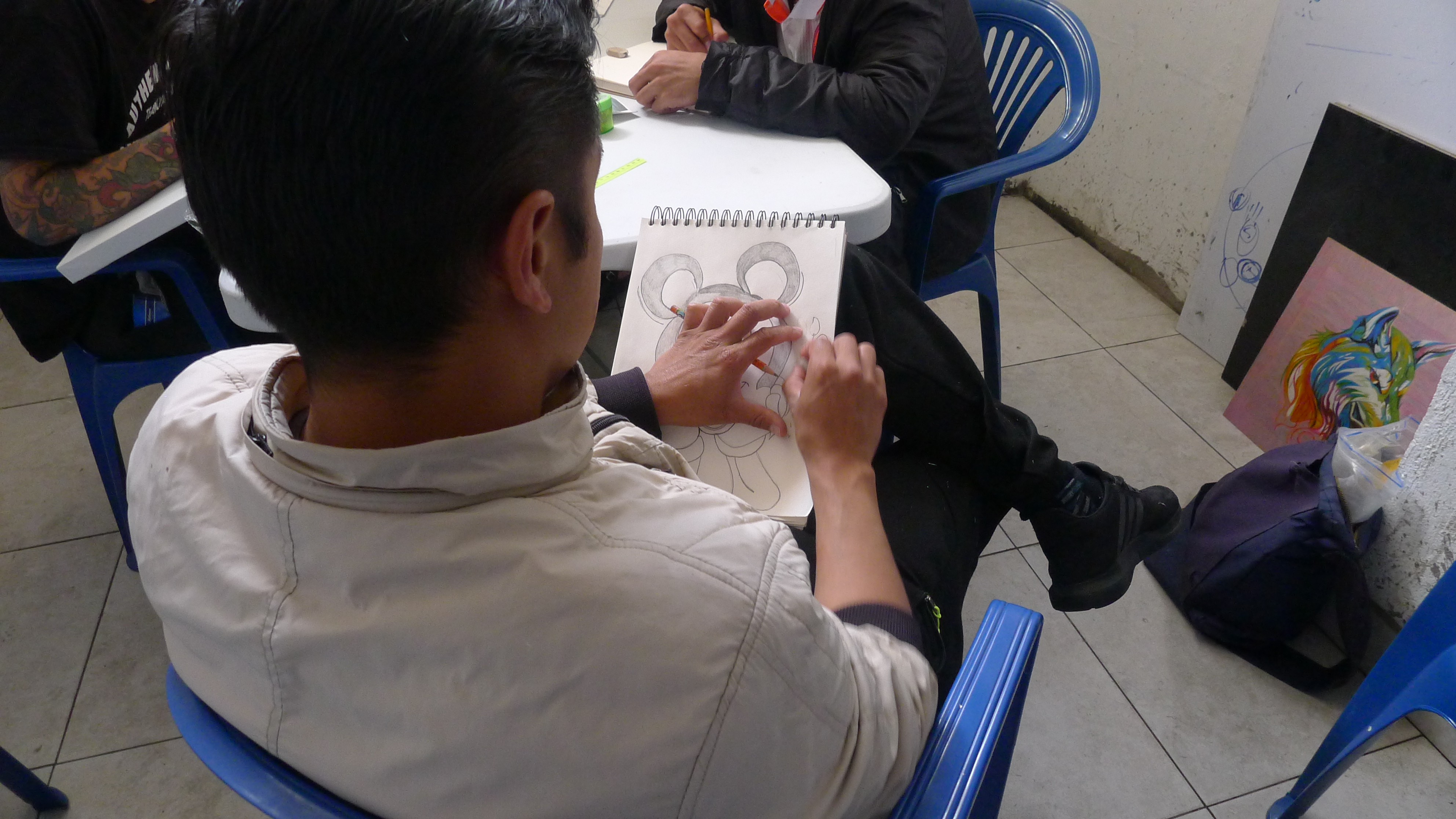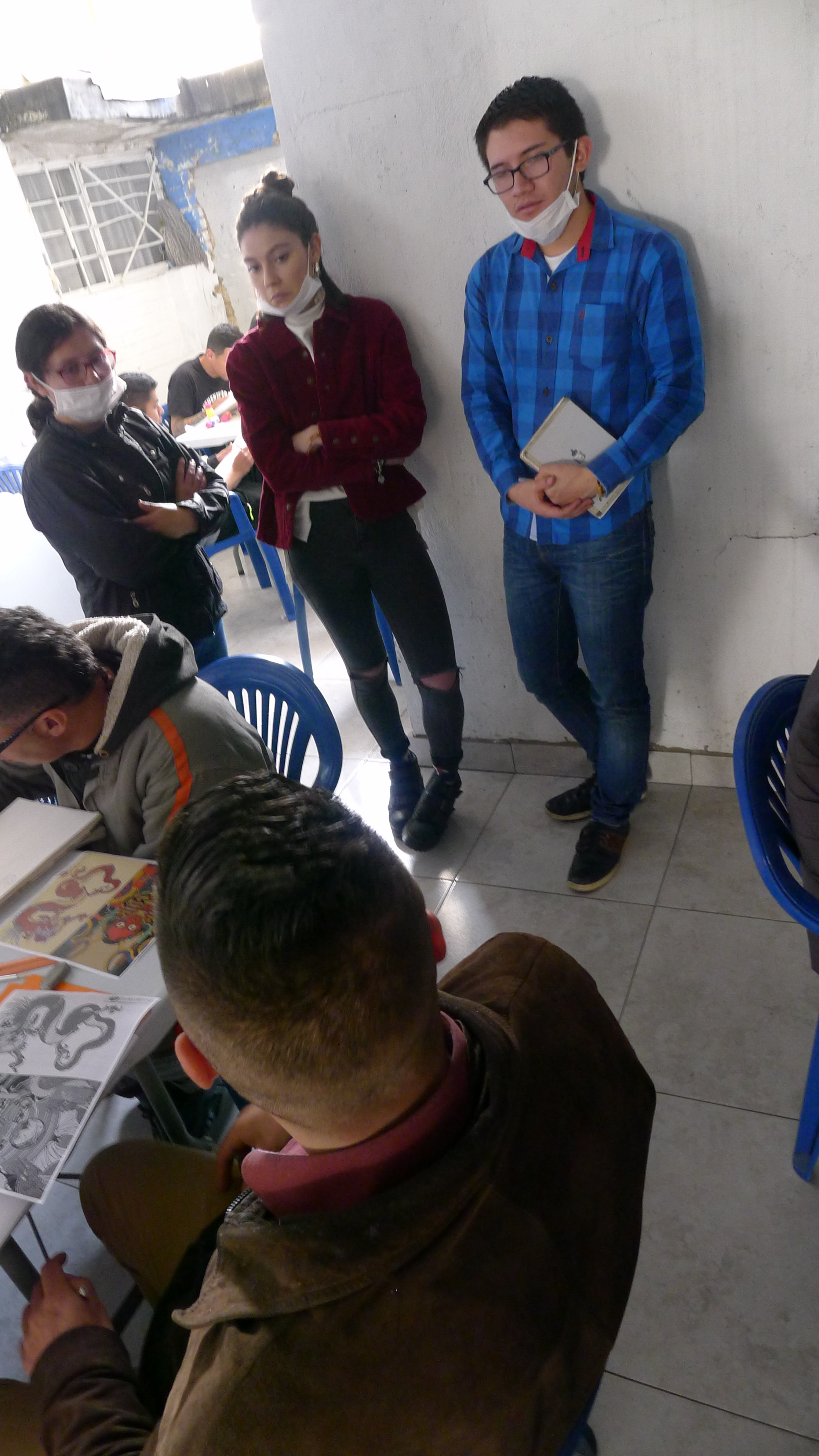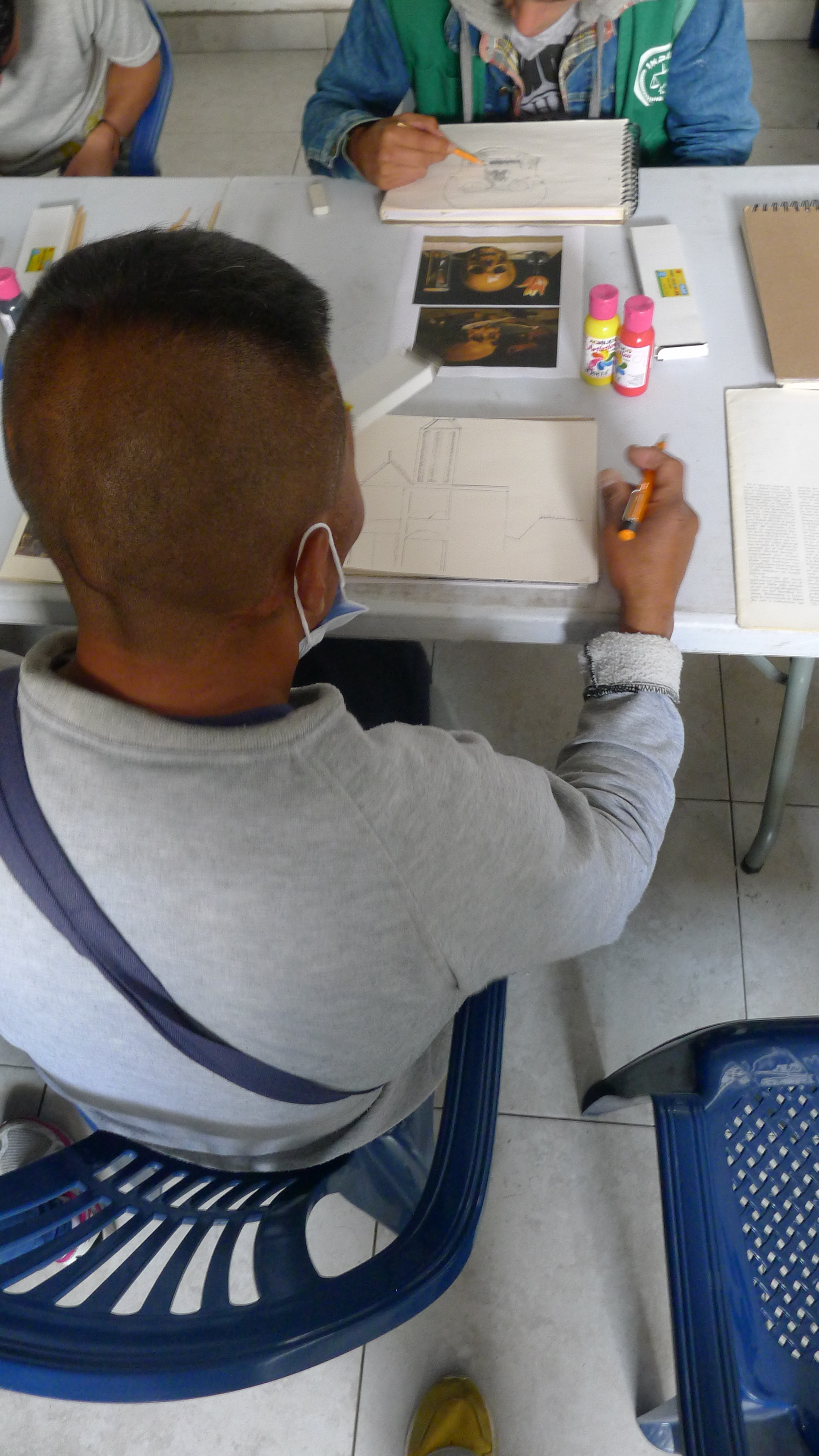 Las imágenes son de las tercera sesión del taller de artes organizado desde el curso de Arte y Cárceles. Hace unas semanas llevamos libretas para dibujar, las repartimos y hoy llevamos otros materiales, unos lienzos, pinturas y pinceles. La idea es que cada persona haga lo que quiera, nosotros solo llevamos cosas, entre materiales e imágenes, y hablamos con cada uno, en orden y en desorden, mientras se usa el tiempo y el espacio para trabajar. Un método casí sin método, que hasta ahora da buenos resultados y donde vemos dibujos que se nos confunden con los que vemos en las clases de dibujo en la universidad (al menos en lo técnico están al mismo nivel). También hicimos una primera sesión de un taller de tejido, y vamos a ver que más pasa con eso. [Los tapabocas eran porque había una epidemia de paperas en unos de los patios, luego, con la llegada de la pandemia del Coronavirus, el ingreso de visitas se canceló. Esperamos poder retomar pronto…)