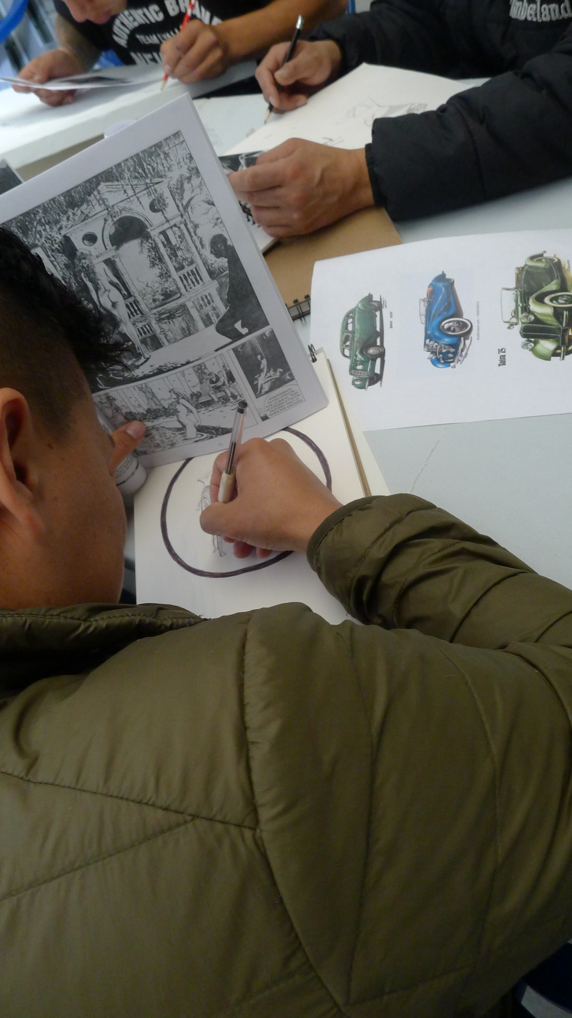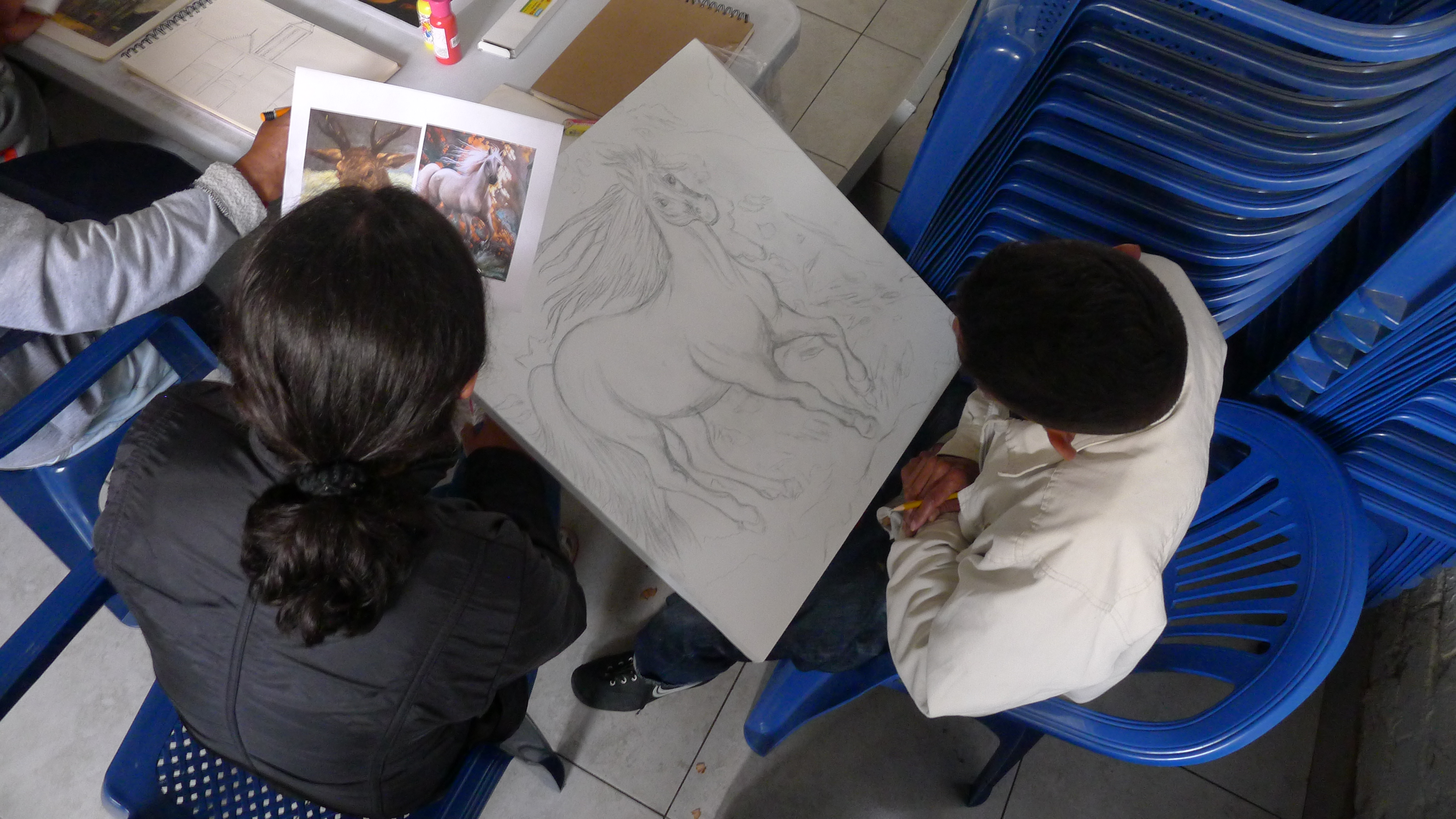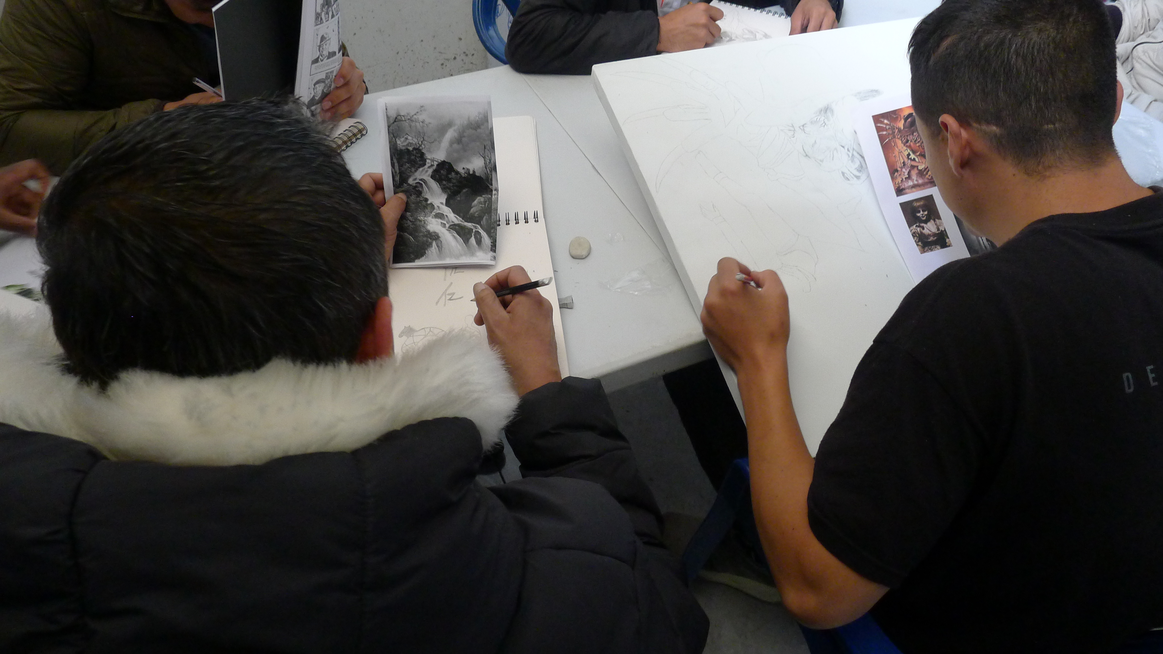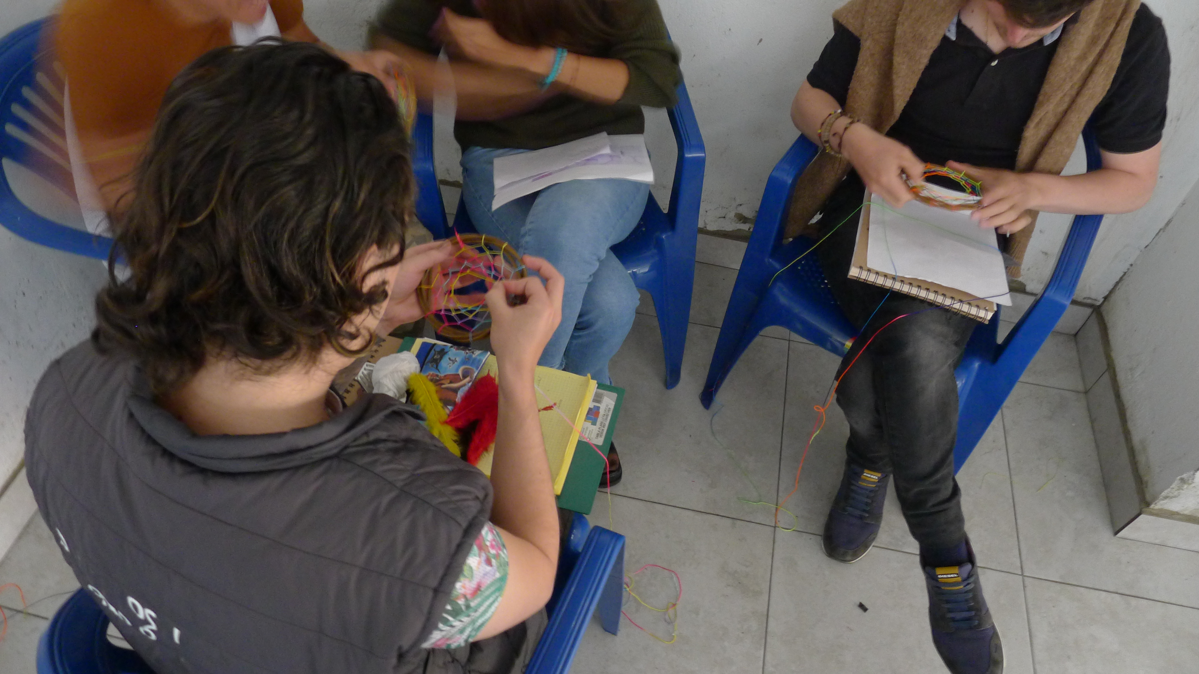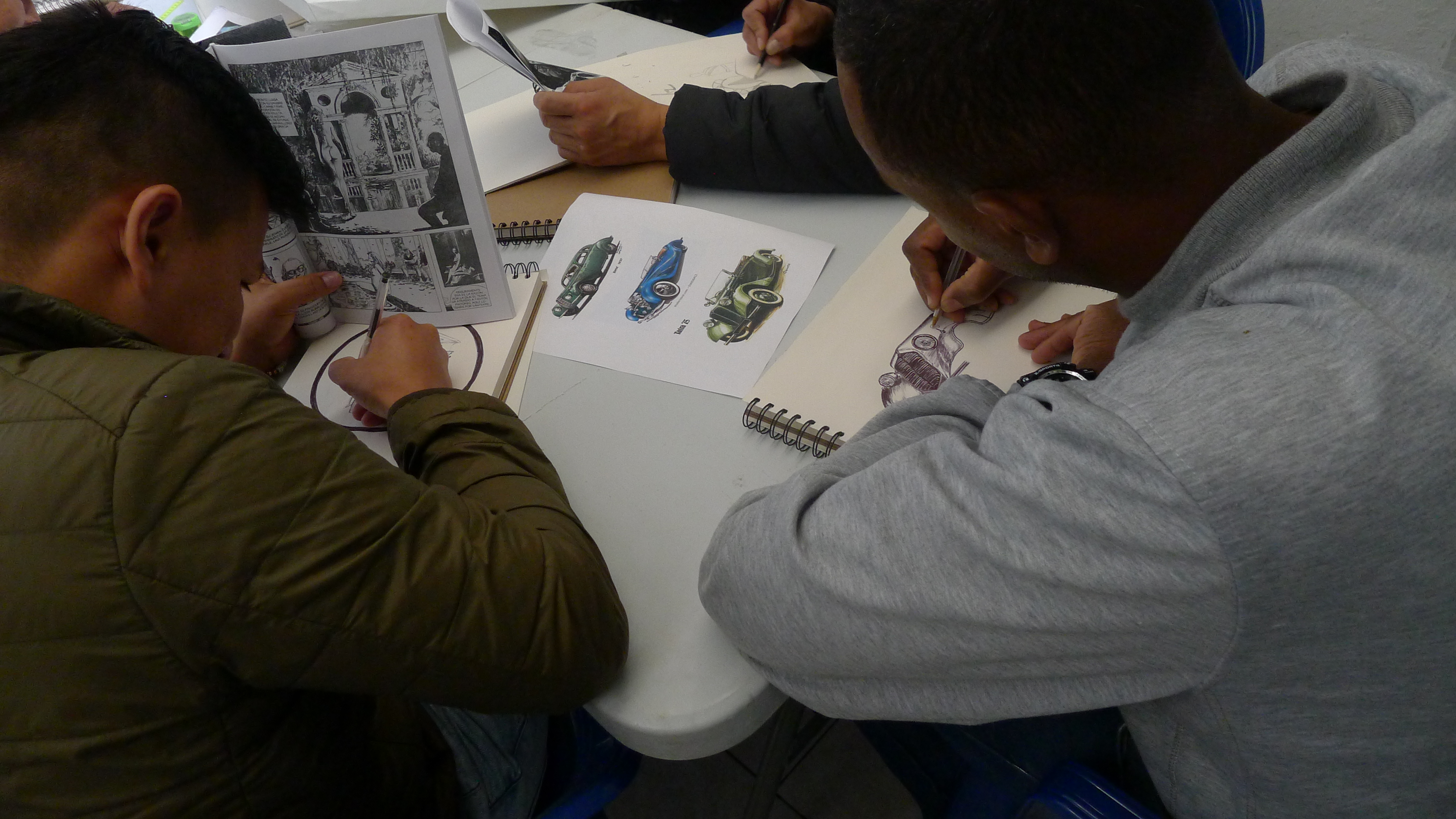 Las imágenes son de las tercera sesión del taller de artes organizado desde el curso de Arte y Cárceles. Hace unas semanas llevamos libretas para dibujar, las repartimos y hoy llevamos otros materiales, unos lienzos, pinturas y pinceles. La idea es que cada persona haga lo que quiera, nosotros solo llevamos cosas, entre materiales e imágenes, y hablamos con cada uno, en orden y en desorden, mientras se usa el tiempo y el espacio para trabajar. Un método casí sin método, que hasta ahora da buenos resultados y donde vemos dibujos que se nos confunden con los que vemos en las clases de dibujo en la universidad (al menos en lo técnico están al mismo nivel). También hicimos una primera sesión de un taller de tejido, y vamos a ver que más pasa con eso. [Los tapabocas eran porque había una epidemia de paperas en unos de los patios, luego, con la llegada de la pandemia del Coronavirus, el ingreso de visitas se canceló. Esperamos poder retomar pronto…)