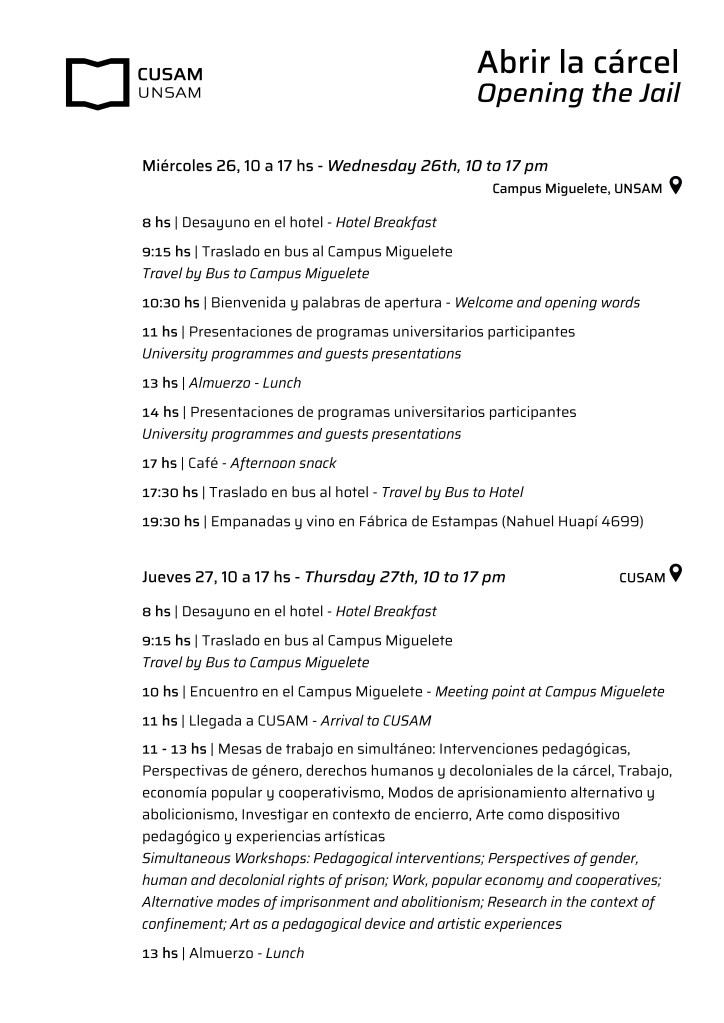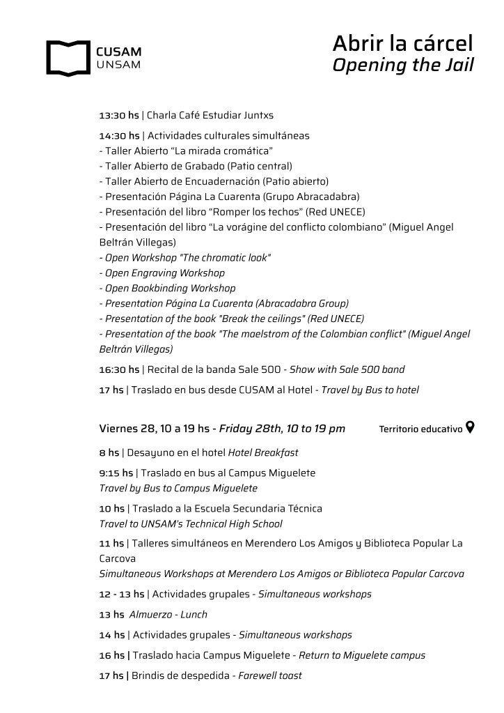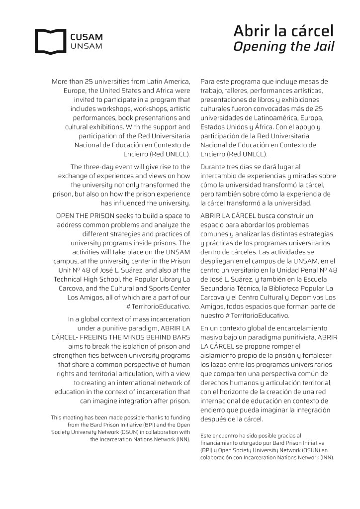 Para este programa que incluye mesas de trabajo, talleres, performances artísticas, presentaciones de libros y exhibiciones culturales fueron convocadas más de 25 universidades de Latinoamérica, Europa, Estados Unidos y África. Con el apoyo y participación de la Red Universitaria Nacional de Educación en Contexto de Encierro (Red UNECE).