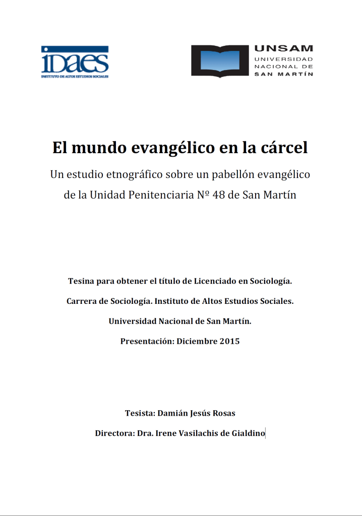 Esta entrada es una introducción a la lectura del texto El mundo evangélico en la cárcel. Un estudio etnográfico sobre un pabellón evangélico de la Unidad Penitenciaria Nº 48 de San Martín. Se trata de una Tesina para obtener el título de Licenciado en Sociología en la Carrera de Sociología del Instituto de Altos Estudios Sociales de la Universidad Nacional de San Martín. El tesista fue Damián Jesús Rosas y su Directora fue la Dra. Irene Vasilachis de Gialdino. Esta tesina es producto del programa educativo del Centro Universitario San Martín (CUSAM), creado por la Universidad Nacional de San Martín en el interior de la Unidad Penal N.° 48 del Servicio Penitenciario Bonaerense (SPB), en la localidad de José León Suárez del partido de General San Martín (Provincia de Buenos Aires, Argentina).