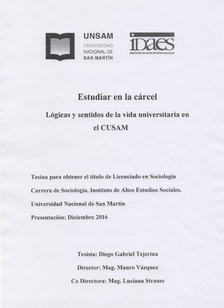 Esta entrada es una invitación a la lectura del texto Estudiar en la cárcel: lógicas y sentidos de la vida universitaria en el CUSAM. Se trata de una Tesina para obtener el título de Licenciado en Sociología en la Carrera de Sociología del Instituto de Altos Estudios Sociales de la Universidad Nacional de San Martín. El tesista fue Diego Gabriel Tejerina, su Director el Magistrado Mauro Vázquez y Codirectora la Magistrada Mariana Strauss. Esta tesina es producto del programa educativo del Centro Universitario San Martín (CUSAM), creado por la Universidad Nacional de San Martín en el interior de la Unidad Penal N.° 48 del Servicio Penitenciario Bonaerense (SPB), en la localidad de José León Suárez del partido de General San Martín (Provincia de Buenos Aires, Argentina).