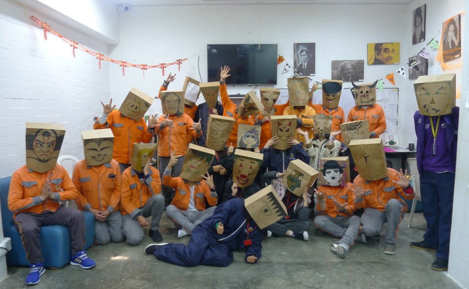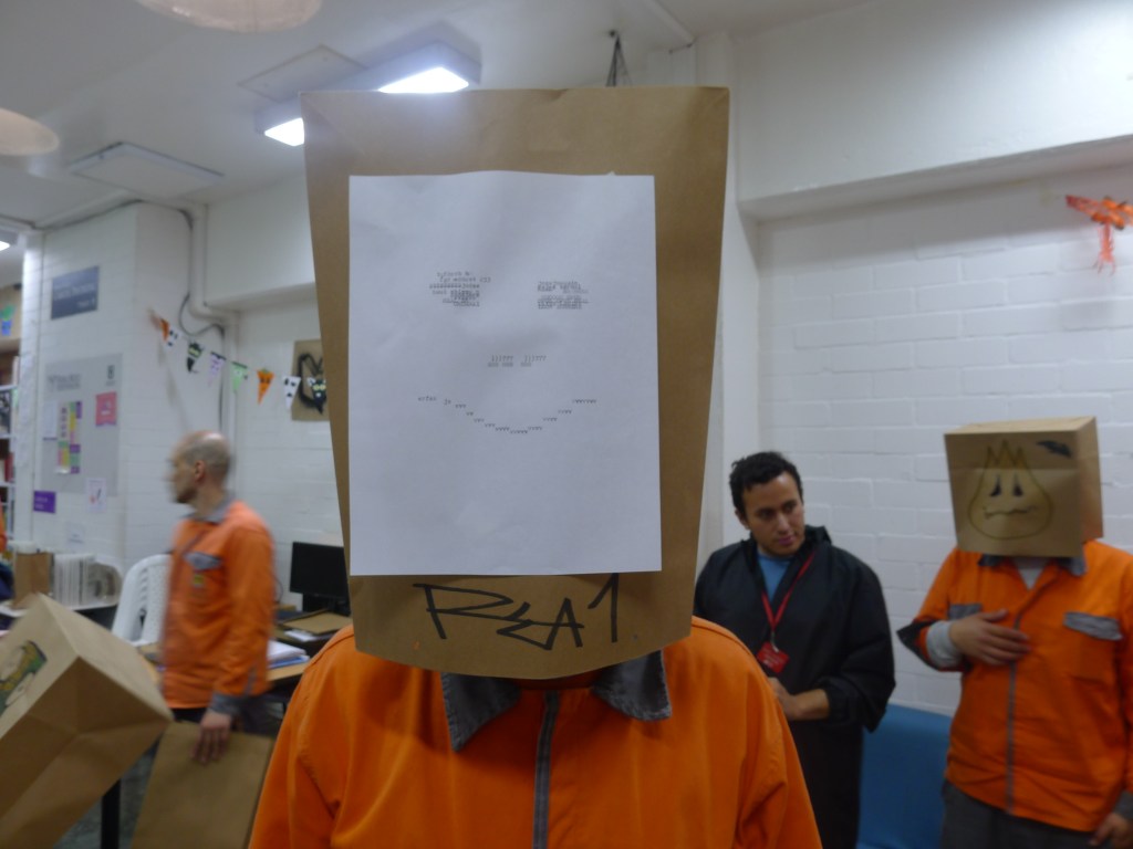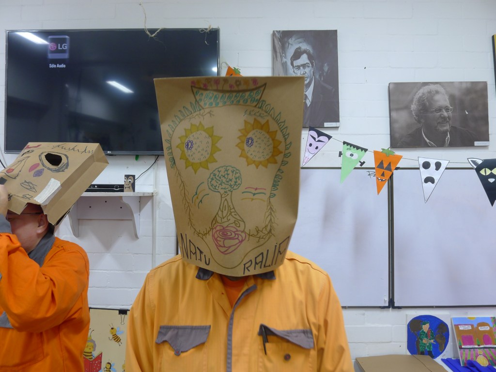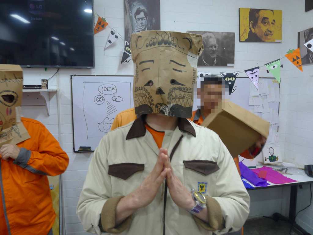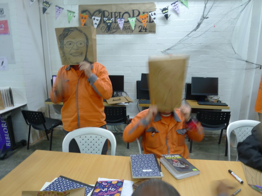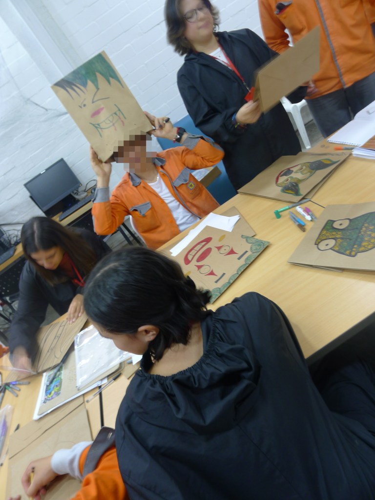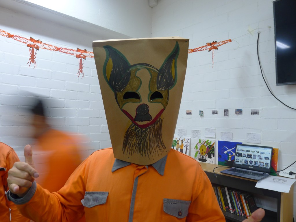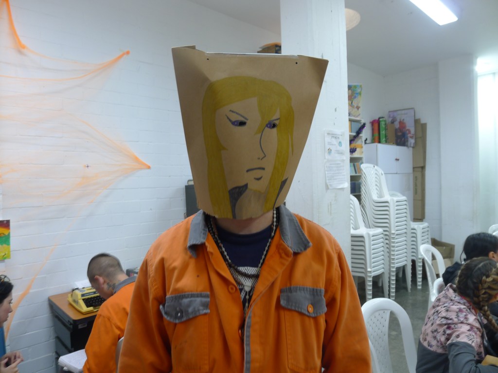 En la temporadas del día de las brujas y las fiestas de disfraces las personas del Taller de Arte y Cárceles que tiene lugar en la biblioteca de la Cárcel Distrital, llevamos bolsas de papel y materiales para hacer máscaras: ver lo que revelamos y dejamos de revelar.