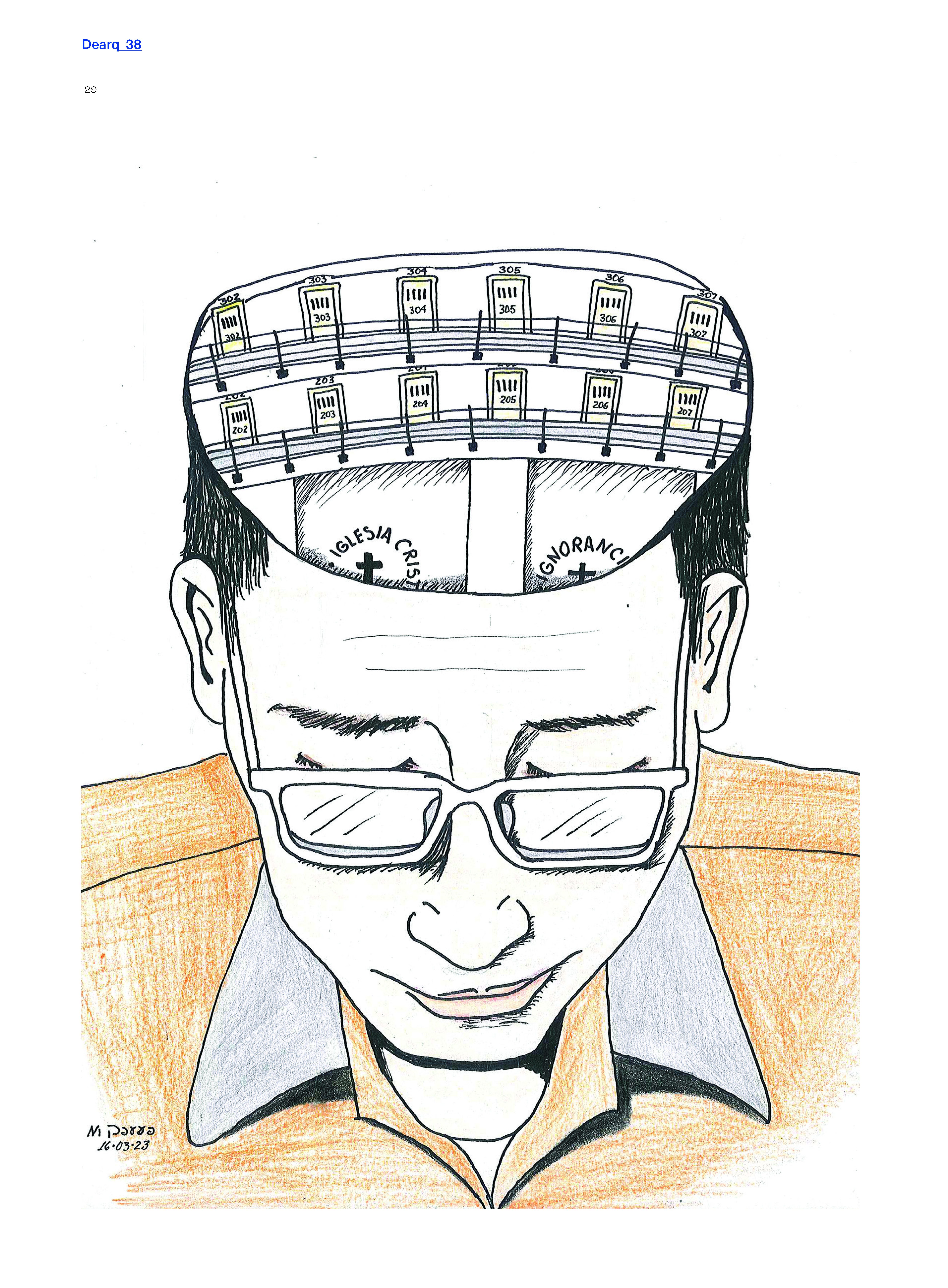 «En la Cárcel Distrital de Bogotá, concretamente en la biblioteca pública de BibloRed de la Alcaldía de Bogotá, un grupo numeroso de personas privadas de la libertad se reúne semanalmente para participar en sesiones de dibujo. Para este número de la revista Dearq les planteamos la tarea de imaginar la construcción de una nueva cárcel, aprovechando el potencial que brinda la página en blanco y la posibilidad de reducir, en comparación con el potencial ilimitado de la libertad de expresión, la megacárcel a su dimensión más mundana.»